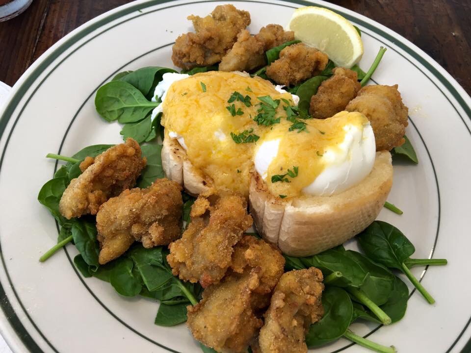 Eggs Louis Benedict: This was the table favorite of the brunch! The dish contains french bread with two perfectly perched poached eggs. This sits atop a sea of spinach surrounded by crispy cornmeal fried oysters. There is an appropriate amount of hollandaise sauce. There was a fantastic and welcomed portion of oysters. Served with choice of potatoes or creamy grits. We selected the grits with this dish. The grits are made with love—I mean love. They were obviously freshly made. They were obviously made to perfection.