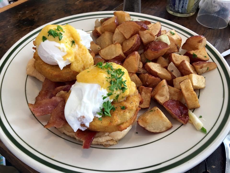 Fried Green Tomato Benedict: Perfectly poached eggs atop thick fried green tomatoes. Served with applewood smoked bacon with your choice of grits or griddled potatoes. We got the potatoes with the dish and they didn’t disappoint. Great serving size and fantastic approach to a kitchen classic.