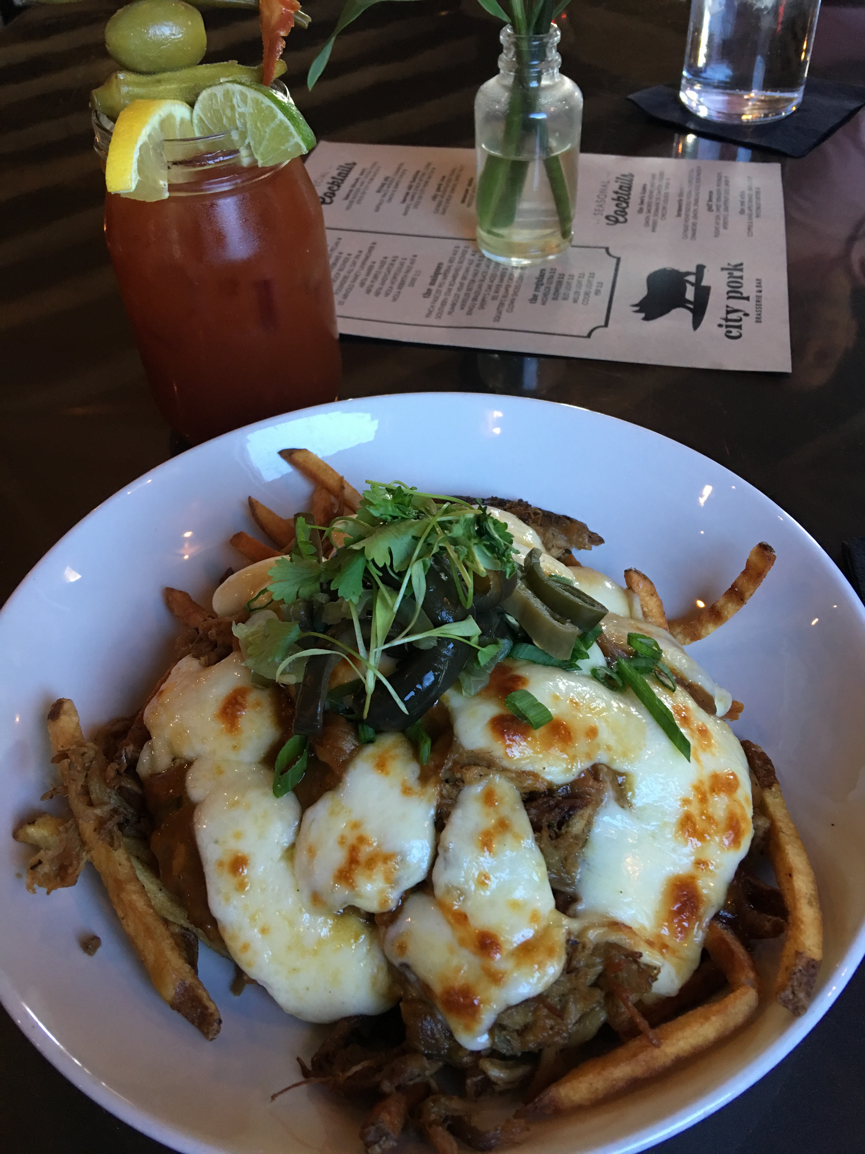 Pork Debris Poutine: pickled jalapeños, applewood smoked cheddar and giblet gravy. This is an appetizer but it could be a main course. We recommend putting an egg on top. The poutine was exactly what you’d think it was. Fries, gravy, cheese curds, but there was the added shredded pork. Again, some use of a pig. This is a delicious starter that you might have difficulty finishing. Bring a friend. Bring several friends. It’s outstanding and very good for a Sunday brunch that might be following a late Saturday.