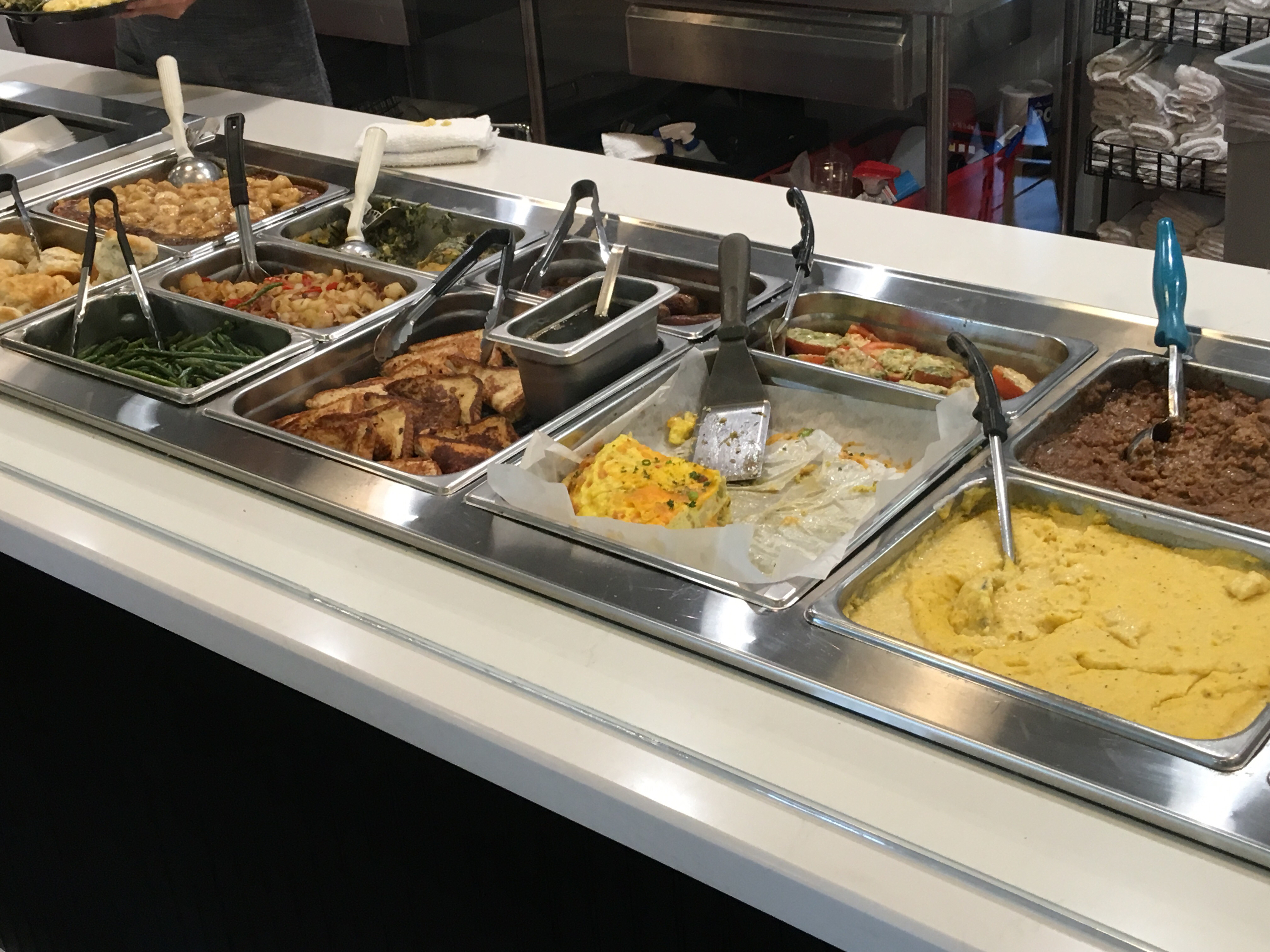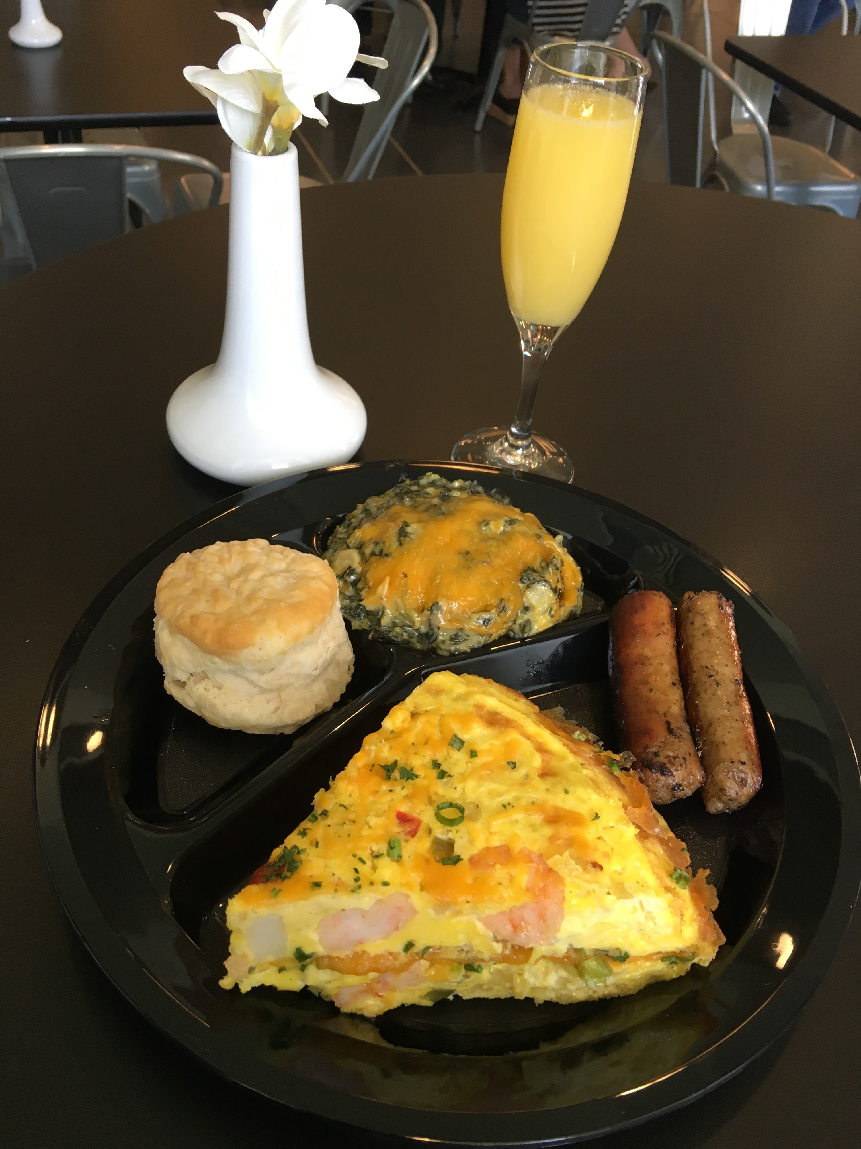 We tried the shrimp omelet entree with spinach madeline, linked sausage, and a biscuit. Eat it there or get it to go. Excellent portion at a reasonable price! The spinach was a treat and the omlet contain deliciously well sized shrimp and perfectly season eggs. Linked sausage is also outstanding. Great biscuits.