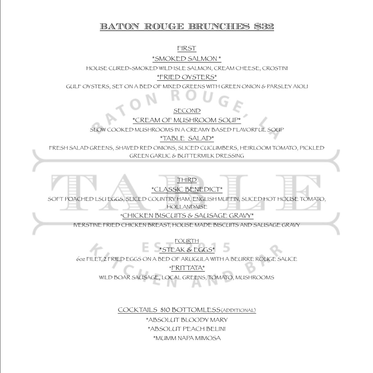 So how will this brunch event work? Table is going to put us on their patio where we can all brunch together. We will all have a chance to meet each other, discuss the dishes and pairings, and we will also have a few special guests. We recommend coming as close to start as possible to help the kitchen out. If you want to bring people, we ask that they RSVP on the event and like Baton Rouge Brunches (of course!). If you can’t make it, then just move your RSVP to interested. We don’t require event ticket purchase prior to events so we try to help the restaurant get an idea of attendees. Lastly, share this event with others on social media. We want to get as many people as possible. We have some great Absolut Vodka and Mumm Nappa drinks and menu pairings. This brunch at Table Kitchen and Bar will be an outstanding Baton Rouge Brunches event!