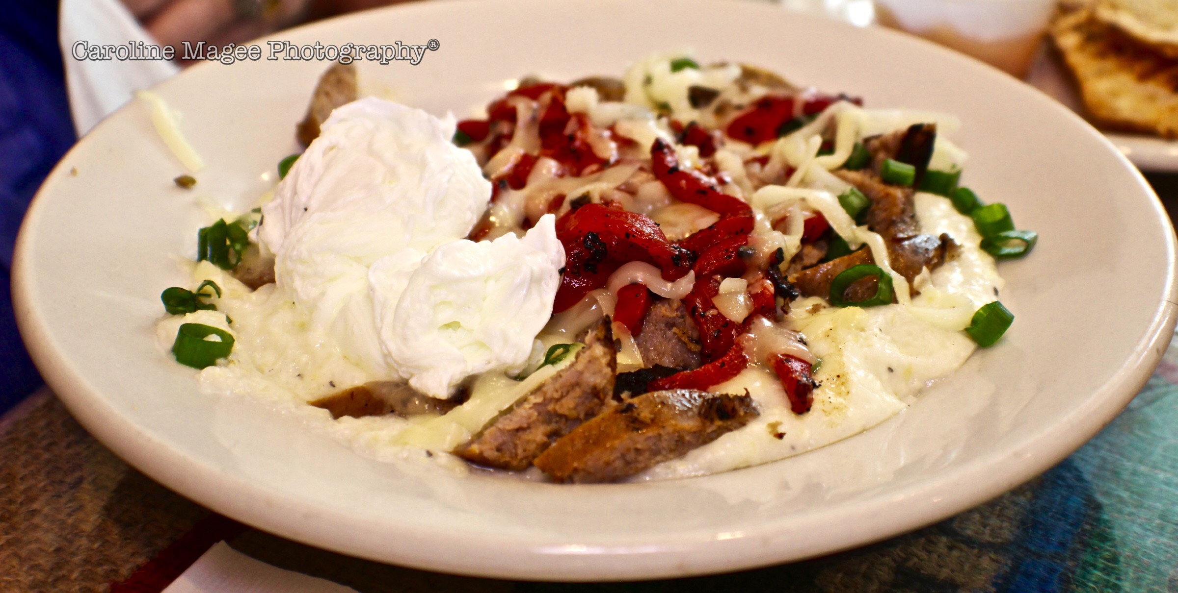 “Italian grits” : fontina cheese, house Italian sausage, green onions, roasted red bell peppers, asiago cheese. Served with one poached egg, ciabatta toast, and house made apple and fig preserves