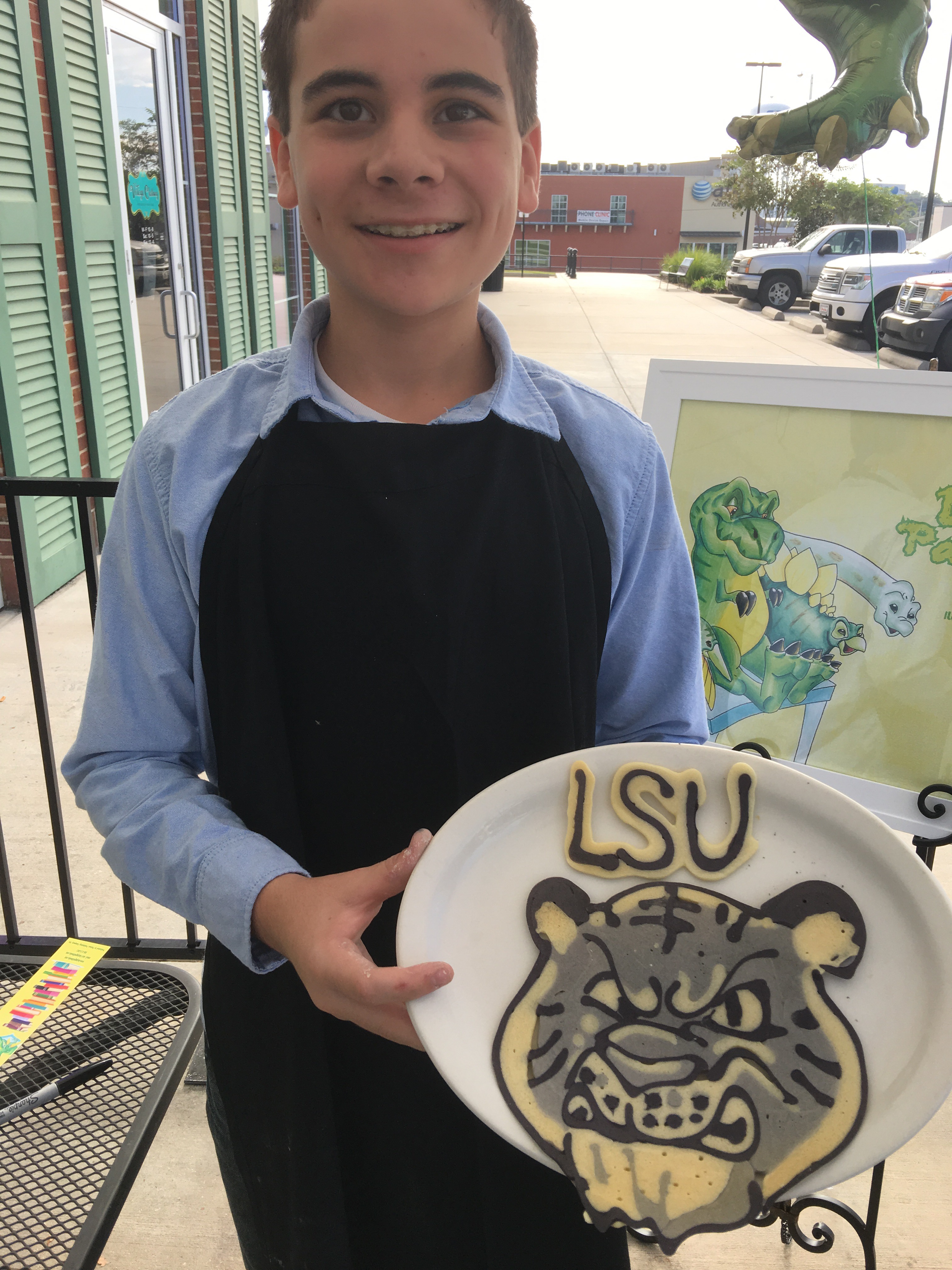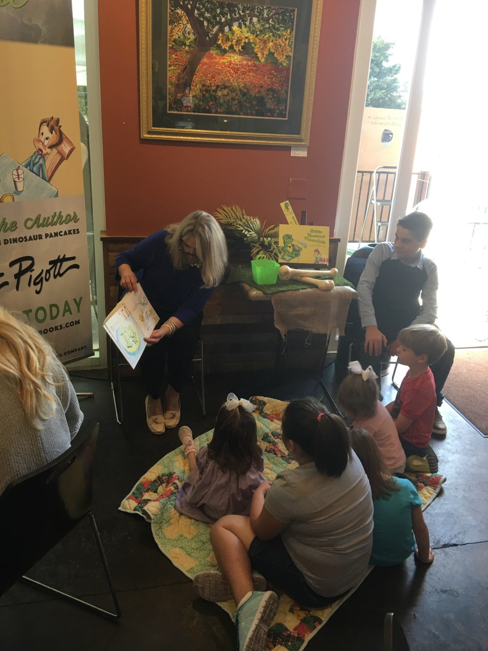 Let’s start with Green Dinosaur Pancakes at La Divina Italian Cafe. The Cafe had a special children’s brunch featuring Kat Pigott and her book, Green Dinosaur Pancakes. The illustrator, Mason Sibley, was also there and was making some cool pancake art! Kat read her book to the children, signed autographs, and there were, of course, green dinosaur pancakes. The menu was fantastic and it was a great community event! The brunch and event was put on a few times Sunday morning and was sold out in advance. We loved it!