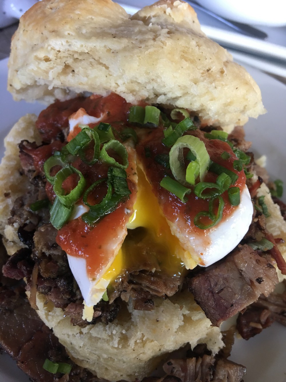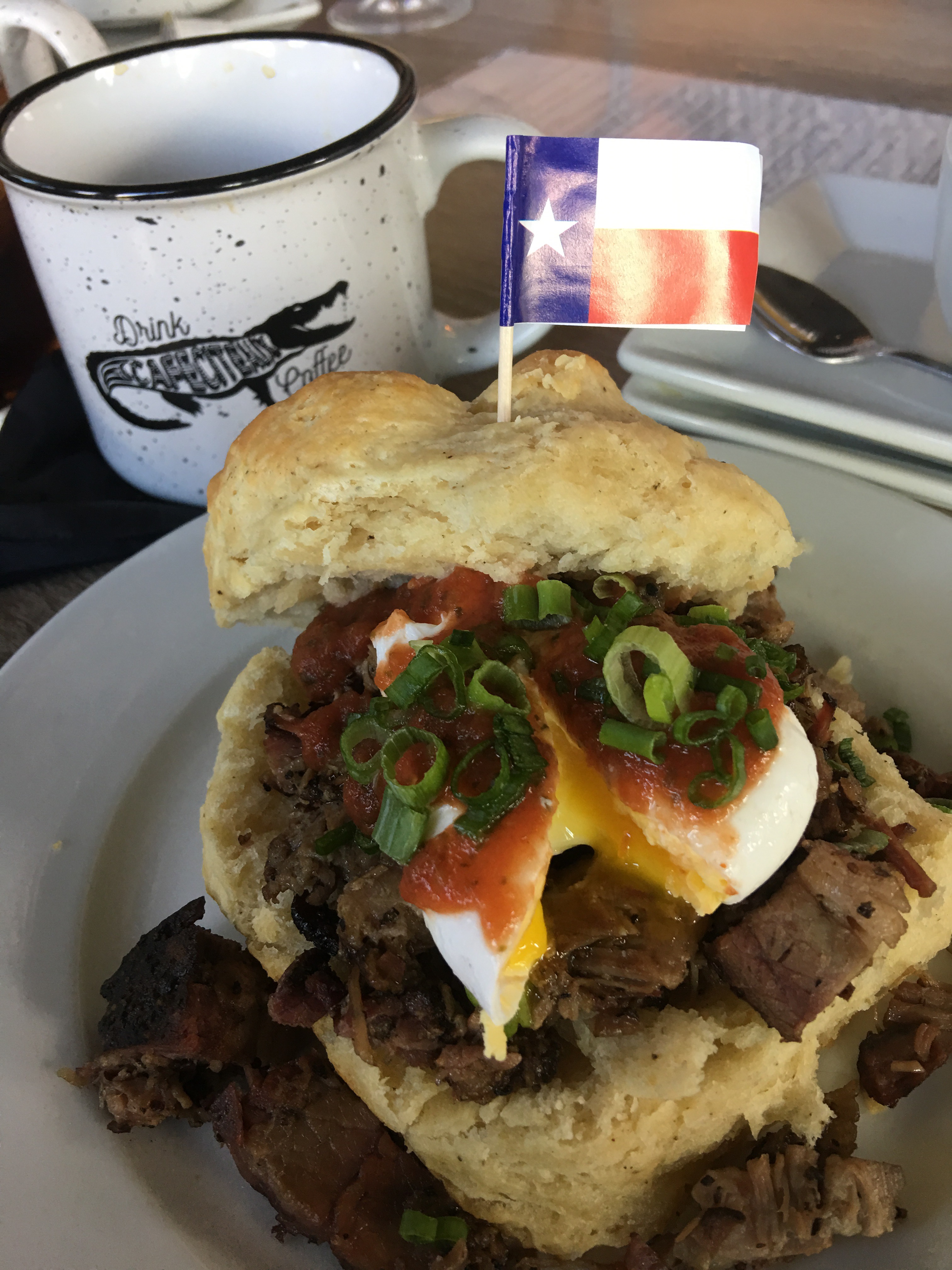 Alex Barbosa prepared 16 pounds of brisket that was served on an enormous biscuit with a poached egg and salsa topping. It did not disappoint and at $4.50 it left us feeling like we got a fantastic deal! The biscuit had a sweetness that balanced the spice of the brisket. The bottomless mimosas were flowing and we also enjoyed a great cup of Cafeciteaux Coffee.